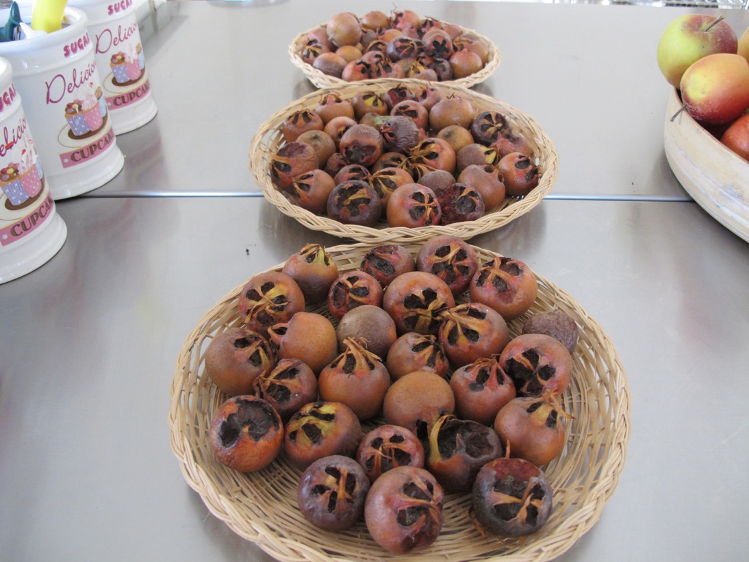 And then there’s the medlars from our tree, and soon to be joined by more from our friend’s tree.  These are quietly bletting on straw platters, waiting to be made into the specialty of the house – Medlar Liqueur.