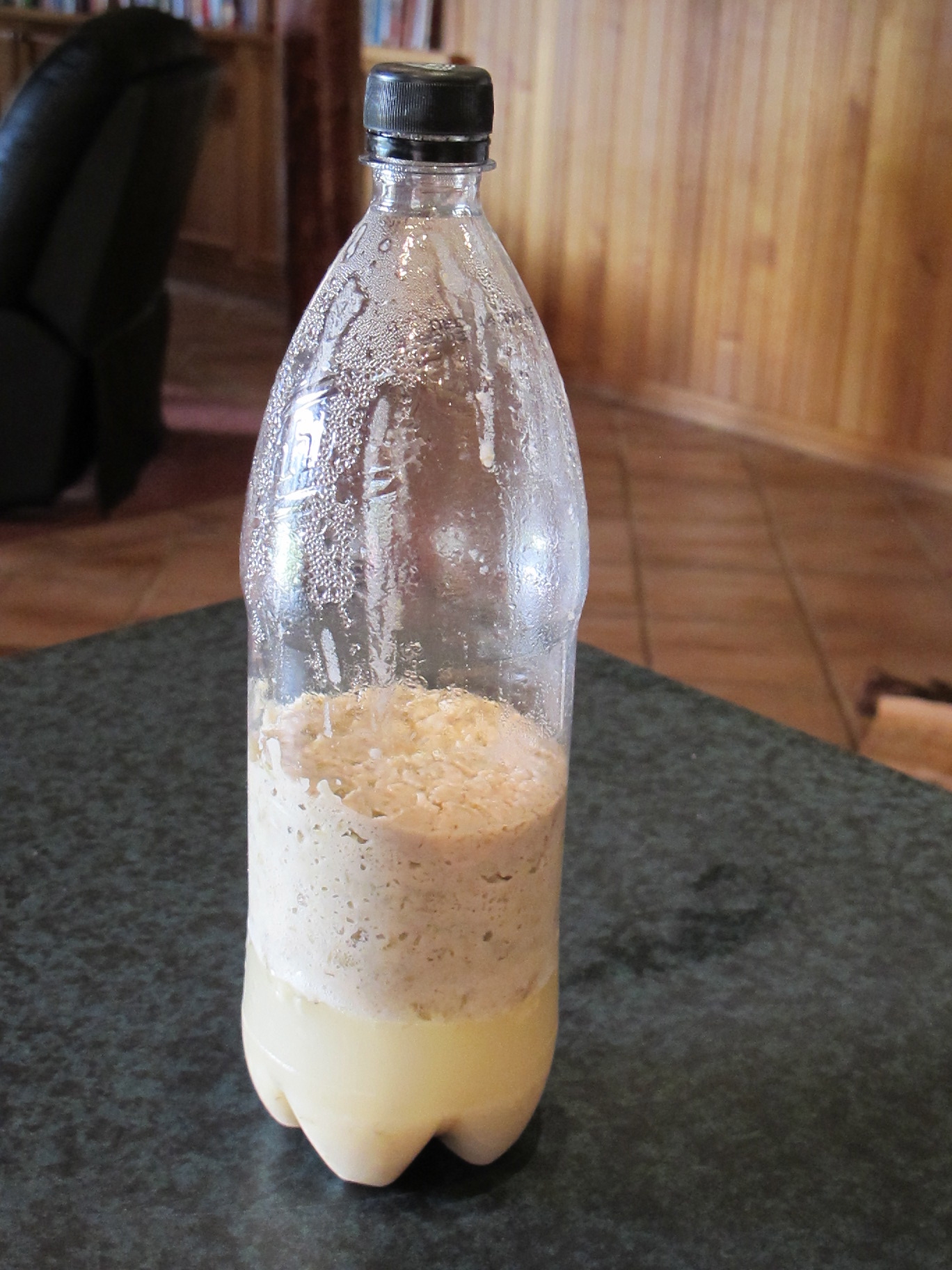 I’m especially pleased because the plant is really quite vigorous as I hope the photo will show – the bottle is bulging a little under the strain and when I removed the lid, it let out a most promising fizz. Small wonder that old recipes used to say to tie down the cork on the glass bottles that they used back then. (My friend said to use a recycled PET bottle as it would have more give)