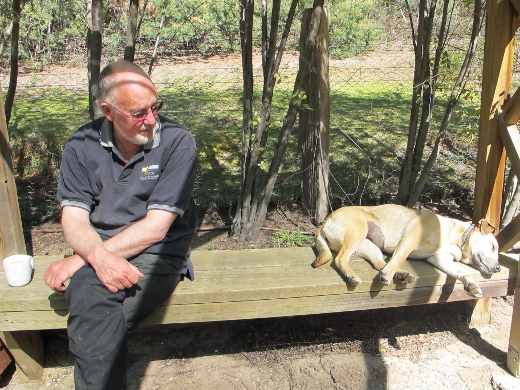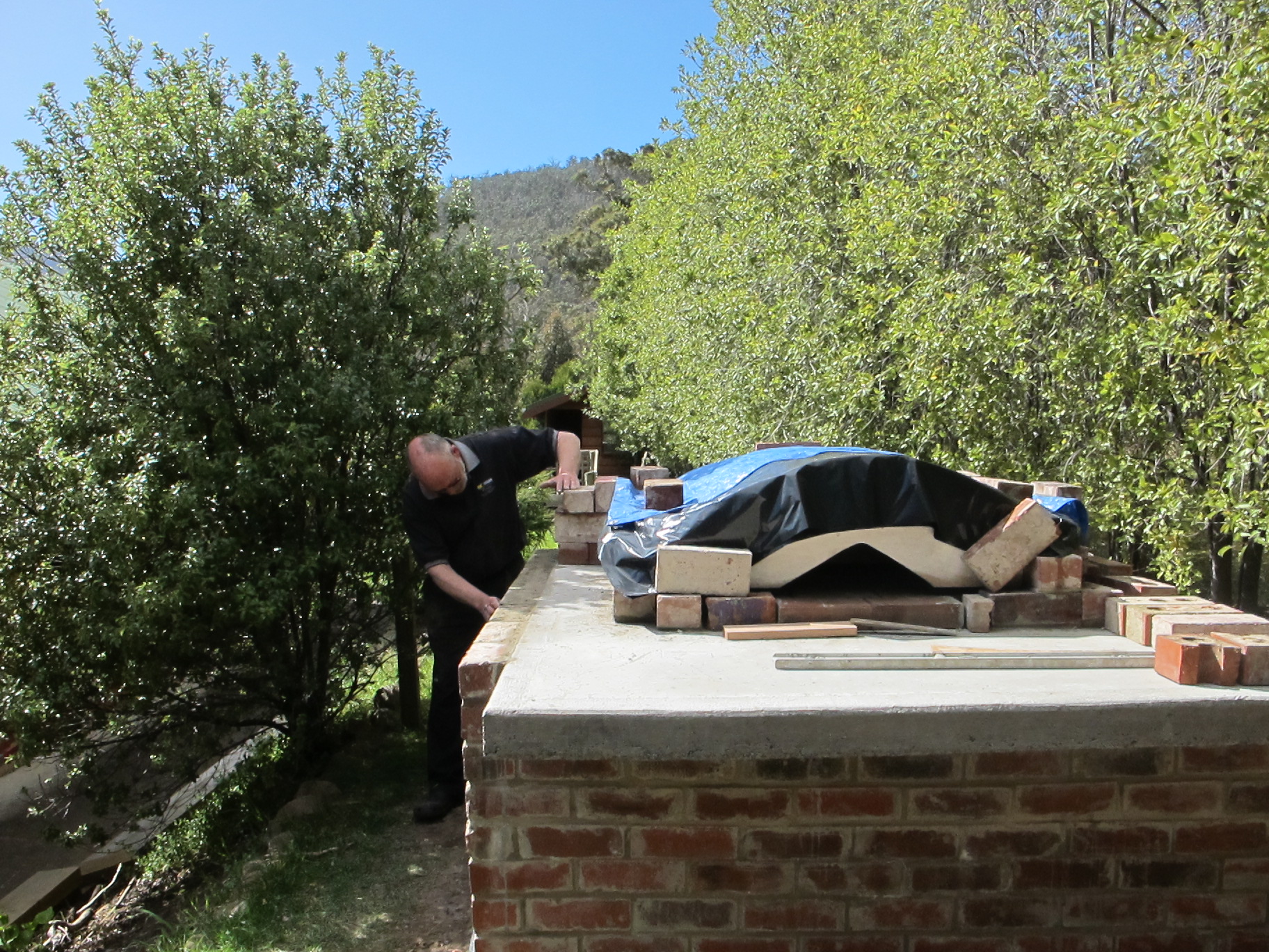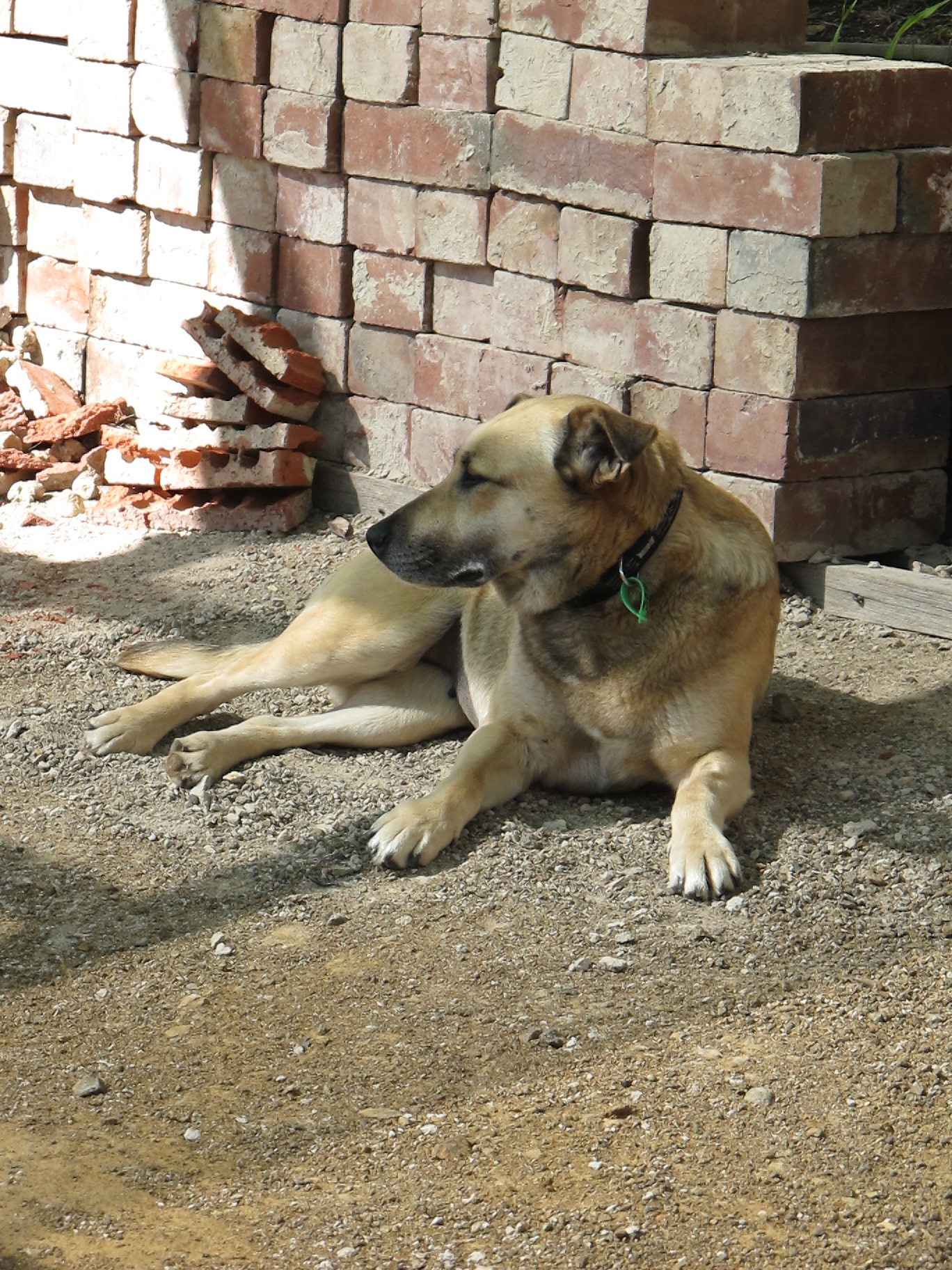 News on the outdoor bread oven front – progress is good and once the door is ready, then the full dome for the top can be set in place. New dog Snowy, an absolute angel, follows Robert wherever he goes and supervises proceedings with the oven, as does Della of course. Time for a break and they all sit down together until the next round of bricks and mortar begins.