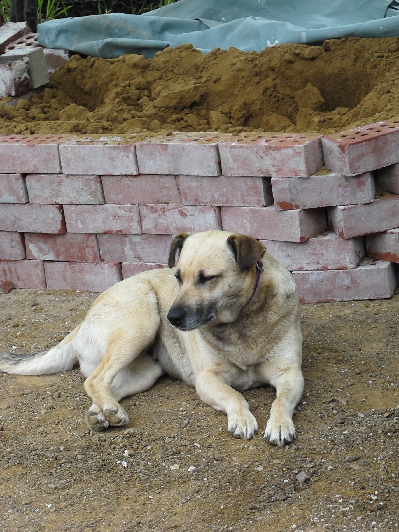 Robert is hard at work laying the outer bricks of the dome, with his constant companions Snow the dog and the ever-curious Tom supervising proceedings.
