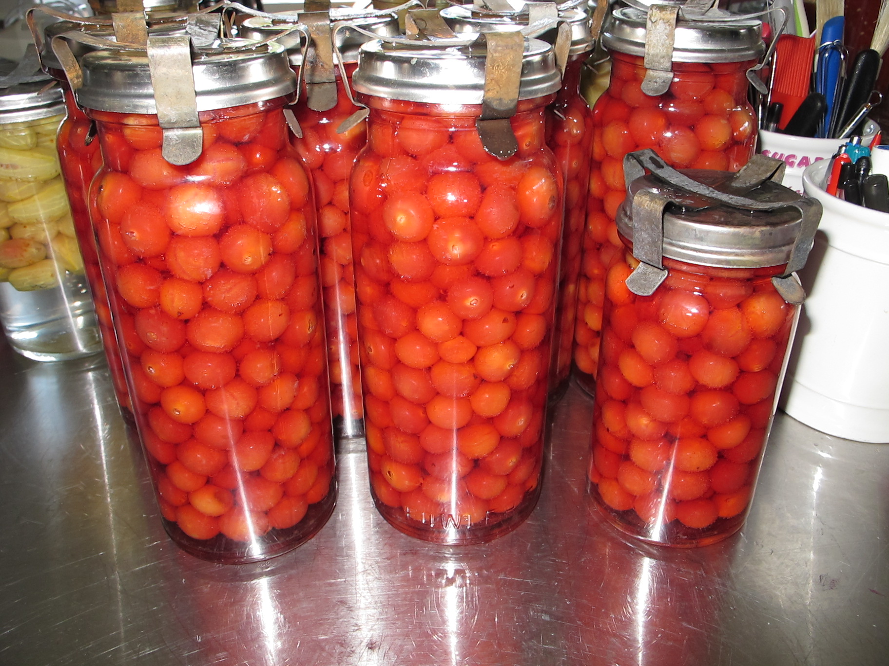 I’m a bit busy today so Robert bottled our share, with enough left over for a batch of jam, a cherry strudel and Kentish cherry pie. Yummo! He bottled the gooseberries too; these always tend to rise in the jars a bit. Easily remedied in two weeks when, by shaking the jar from side to side like crazy, you can make the gooseberries sink down to where they are supposed to be.