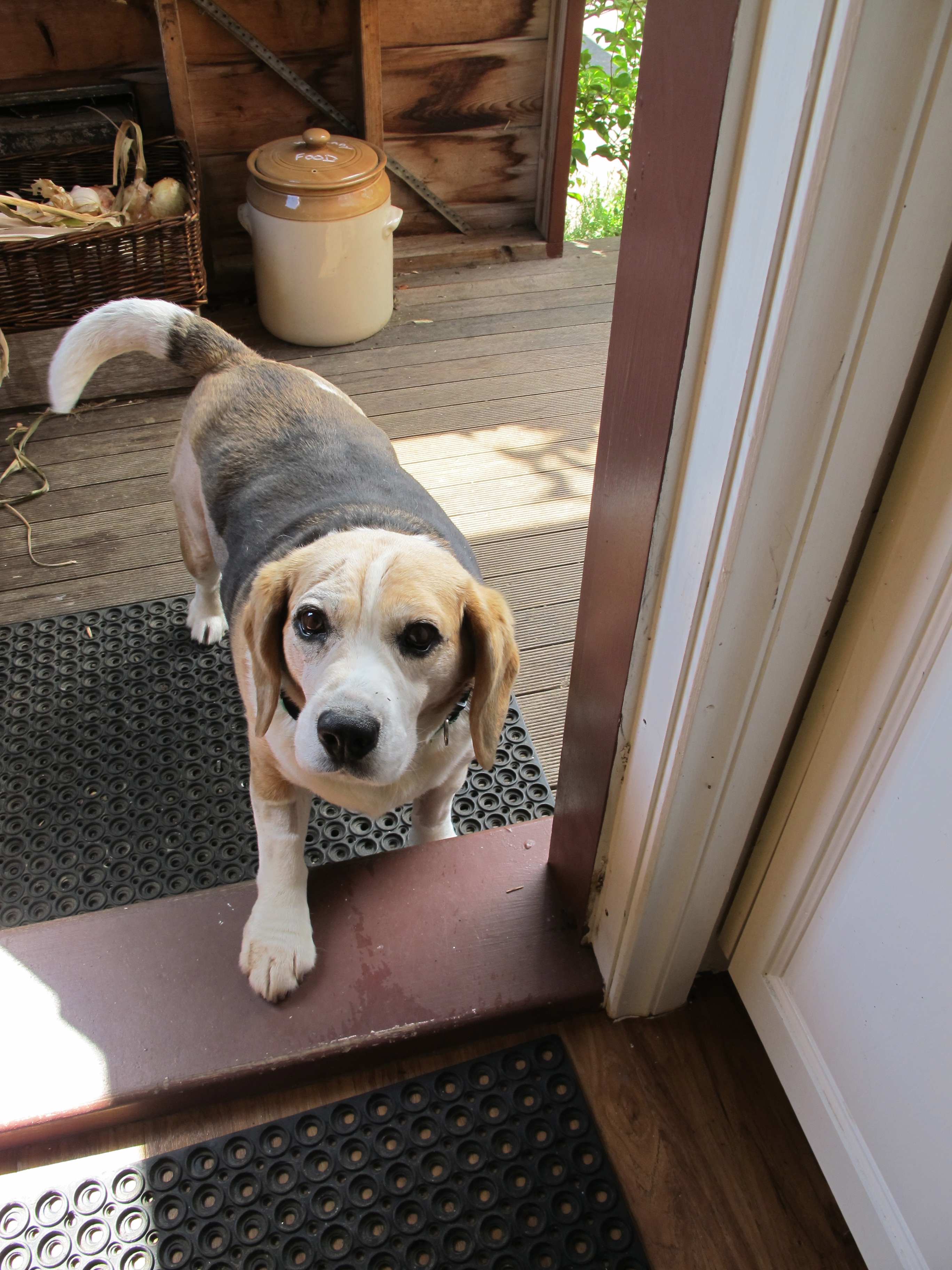 Many thanks to everyone for their concern for our Della. You will be pleased to know that the post-op report from the vet was good. Today for the first time since the attack she toddled up to the cooking school door while a class was in progress (she is ever-hopeful that it’s sausage making day). Her great expectation was rewarded as I cooked a sausage especially for her.