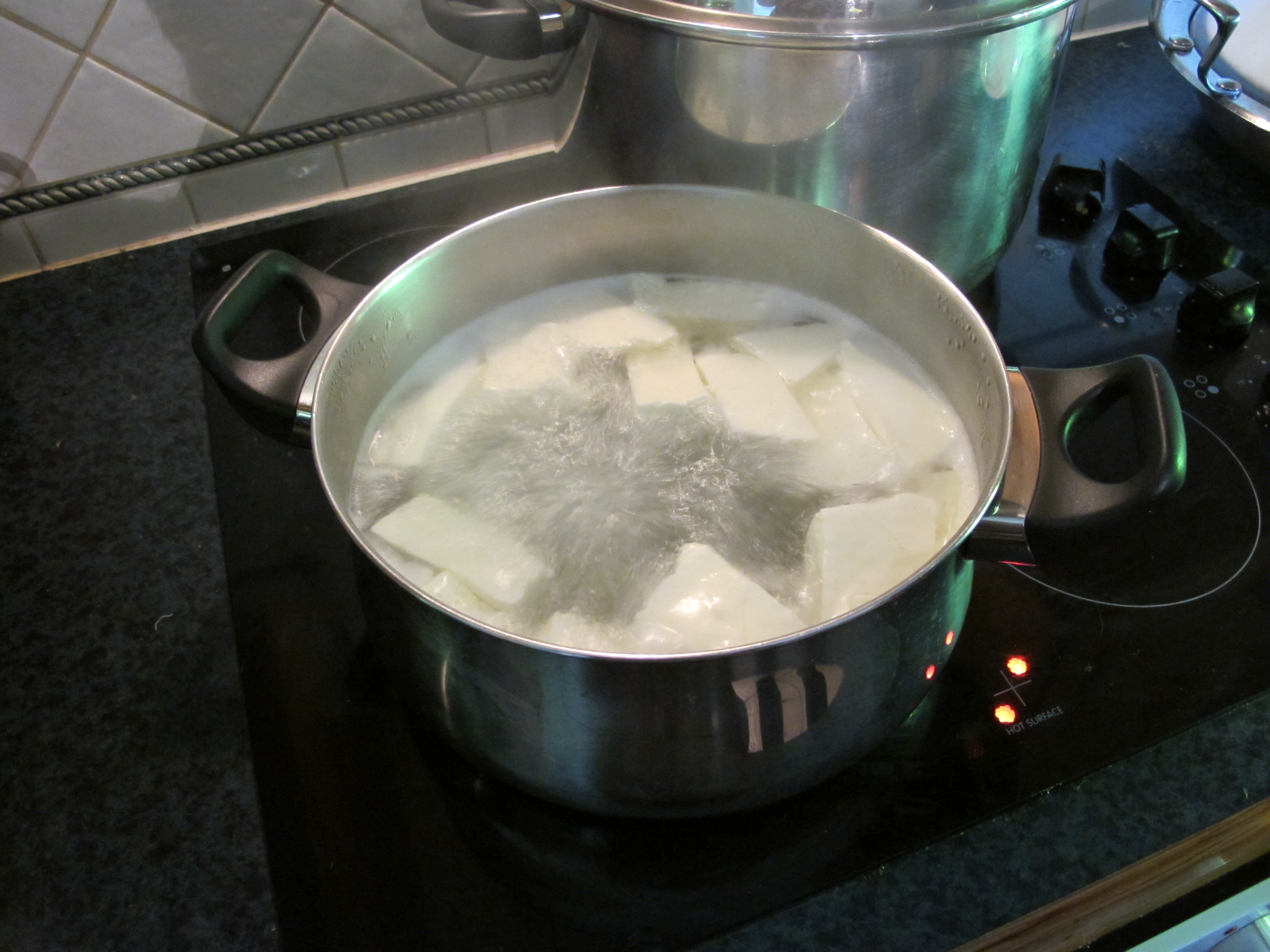 The photos are of the stage of boiling the halloumi curd. The next step was to salt it down, wait for it to cool and then fry in a little butter and olive oil. It disappeared in a flash – grandson Jacob liked it very much indeed.