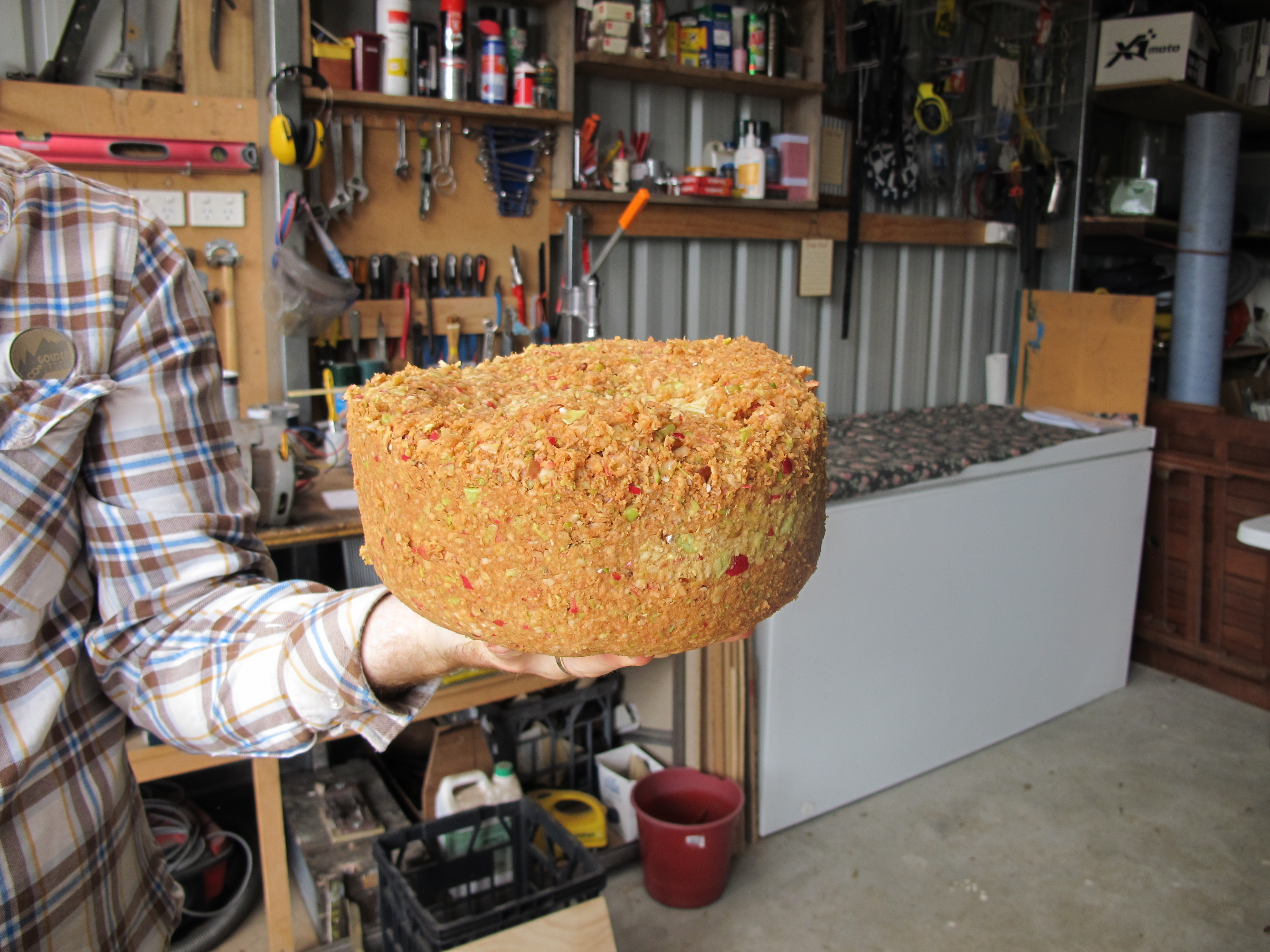 One of the by-products from all the juicing yesterday was, of course, the pulp. Son-in-law Nat here shows a new version of ‘apple cake’.