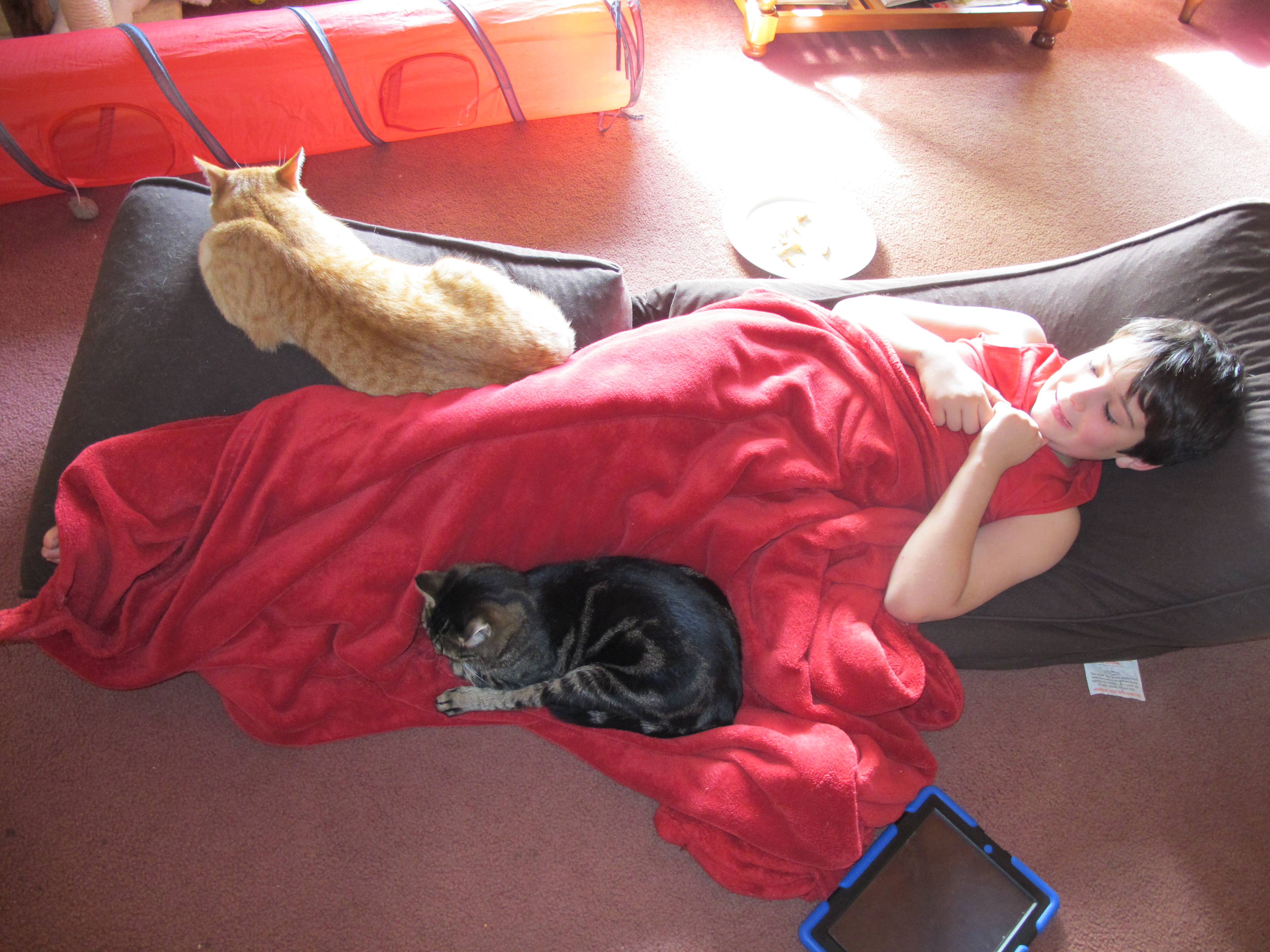 Meanwhile, back at the ranch …. April 17, 2015 Young Jacob had decided to stay with his Grandad rather than come grape picking with us. His favourite spot is the bean bag. Trouble is, it’s also Tom’s – and Rosie is pretty fond of it too. This is the sight we came home to. Pretty cute I think. Share this: Share on X (Opens in new window) X Share on Facebook (Opens in new window) Facebook Like Loading... Related