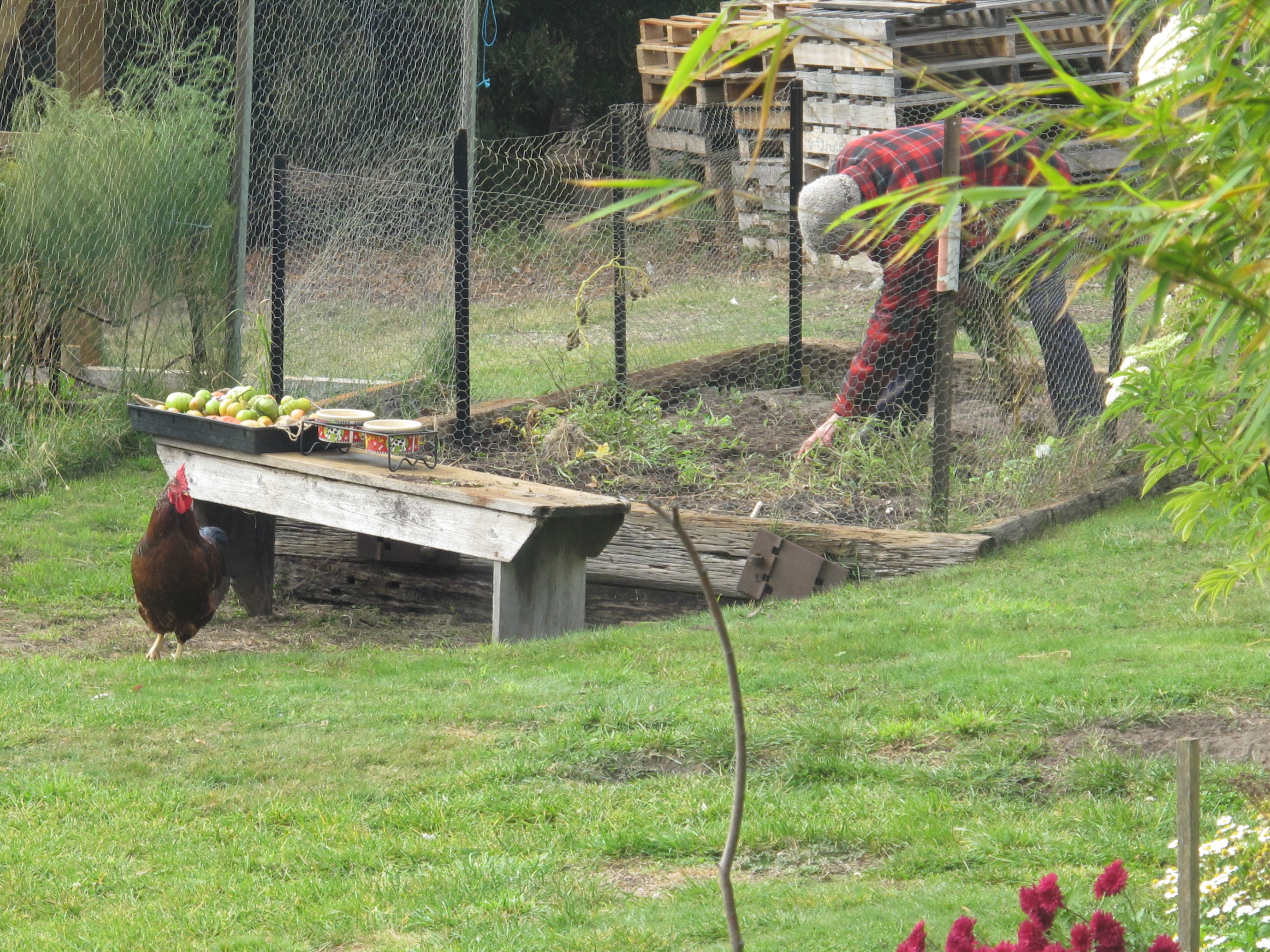 Remember Terry the rooster? He is becoming a real companion. He loves to be with Robert in the garden – likes to chat to him man to man, follows him everywhere.