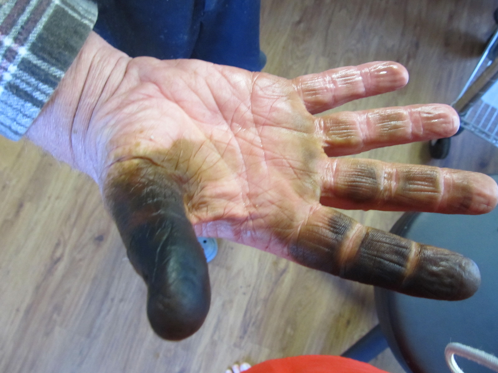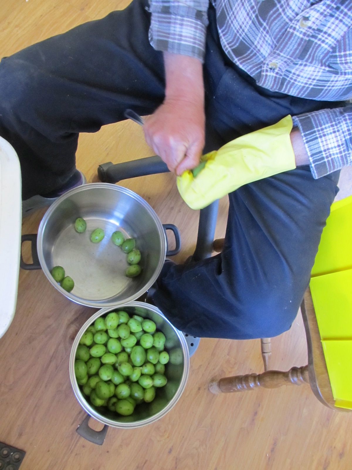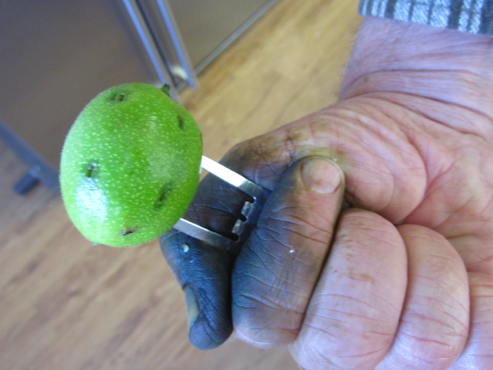 The green walnuts are brining after much effort from Robert, his pricking each and every one with a special fork he’s made. He had a glove on one hand, but not the other – you can see what I meant in the last post when I warned about what would happen to exposed skin. He’ll need to do a lot of washing up for a week or more to clean up that thumb. Not that I’m complaining about that of course.