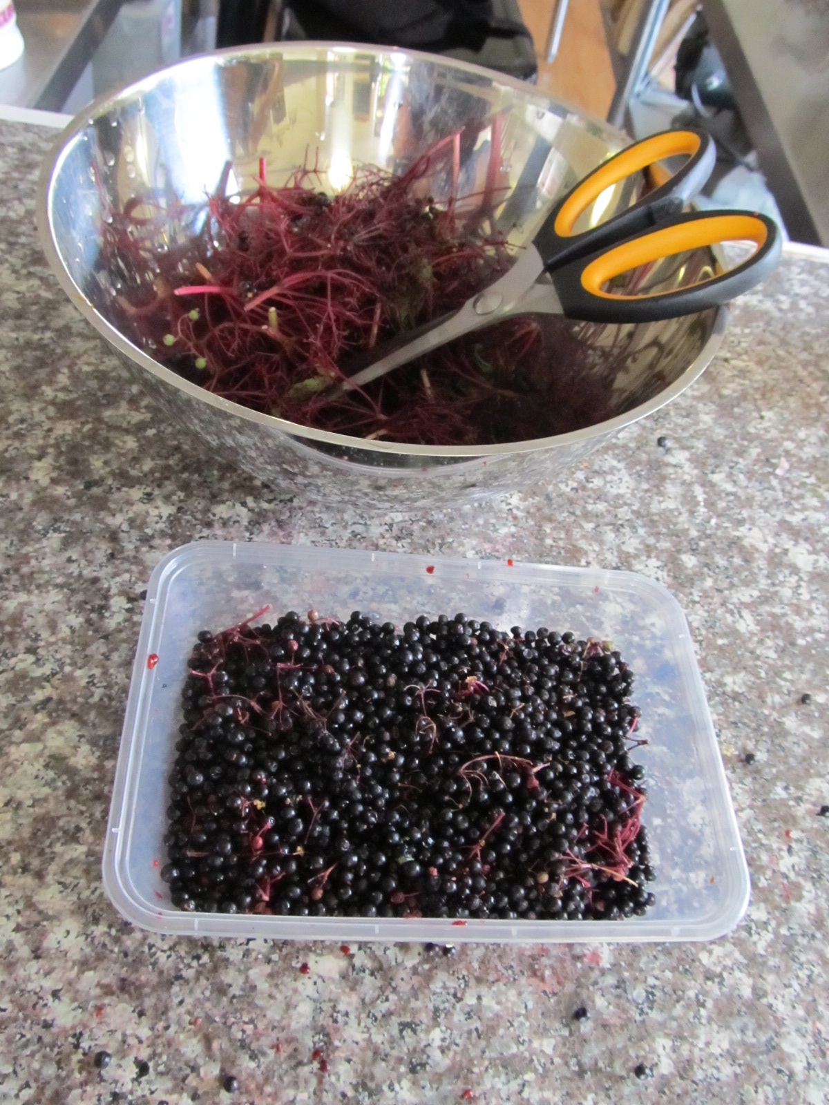 The elderberries are a little tedious to remove from their stalks, but well worth the effort. They make magnificent cordial syrup, and what’s more it’s almost medicinal. Elderflowers and elderberries have been recognised for hundreds of years as ‘the medicine chest of the country folk’. A little of the cordial in a mug of hot water does wonders for the symptoms of a cold.