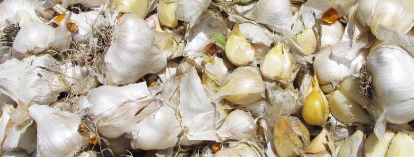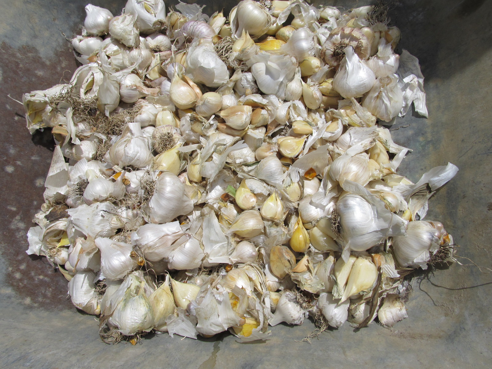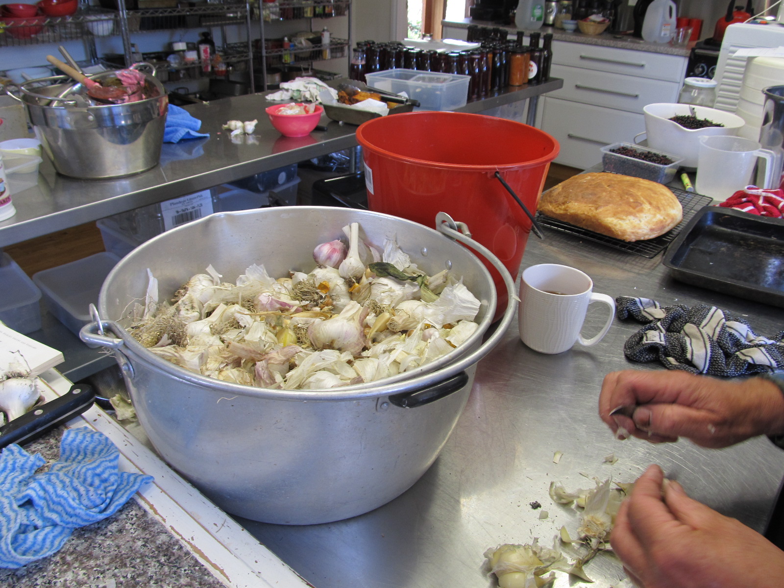 The plaited stalks were stripped of their tops and relegated to the compost heap, and a wheelbarrow load of the knobs of garlic taken around to the cooking school kitchen.