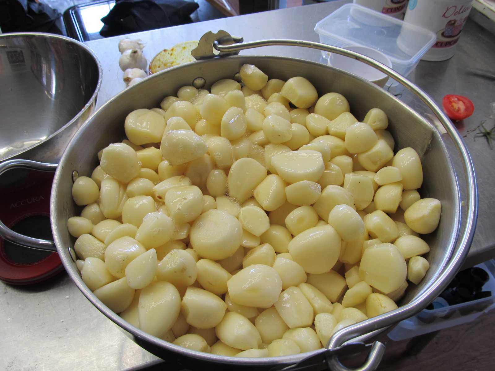 Hours and hours and hours later, with Stephanie and Robert peeling the cloves flat out and me rather more randomly (I was bottling off everything else from yesterday at the same time), almost 6 kilos of garlic cloves sat waiting to be blanched, then to be immersed in a salted, slightly sweetened vinegar.