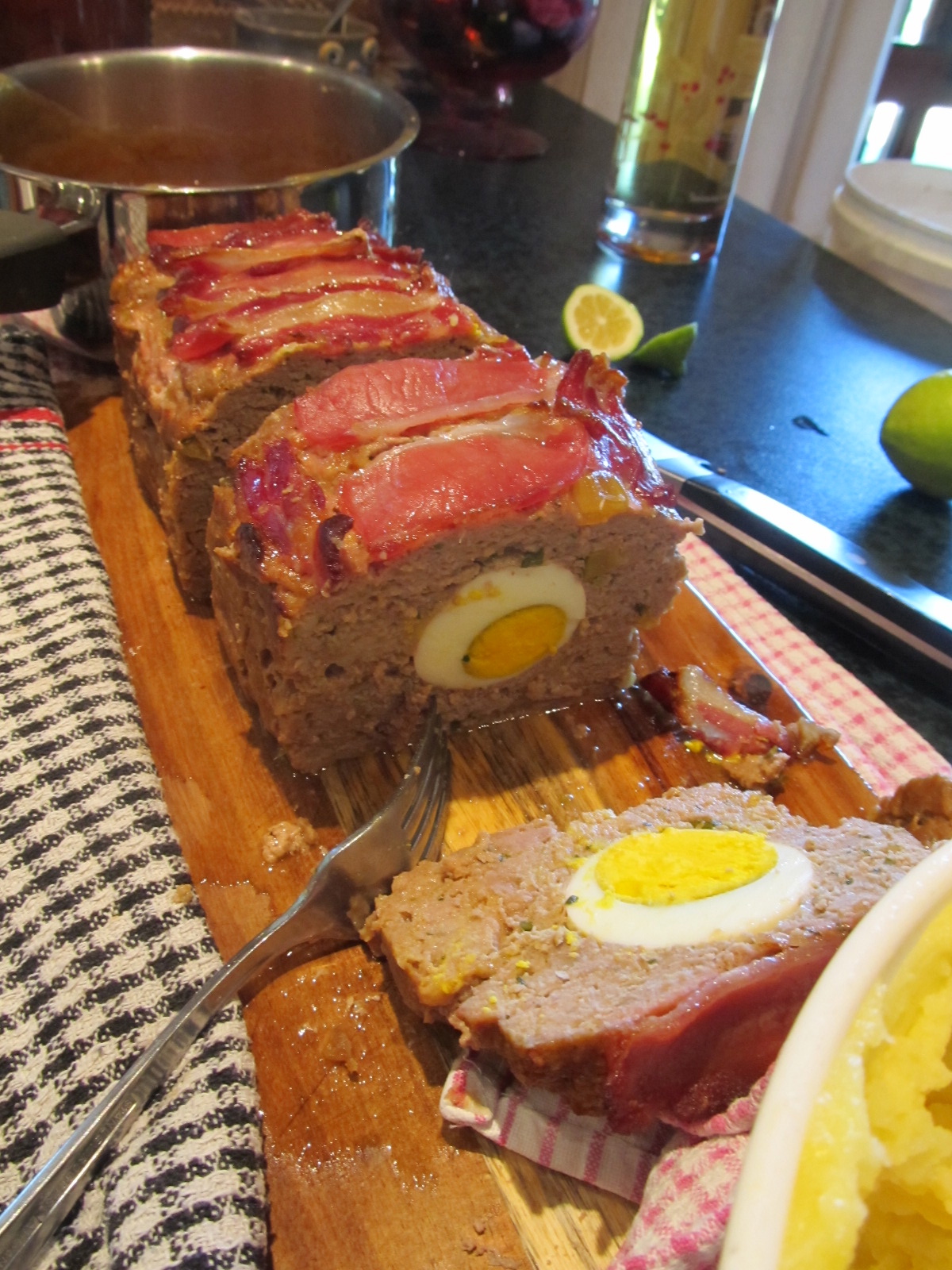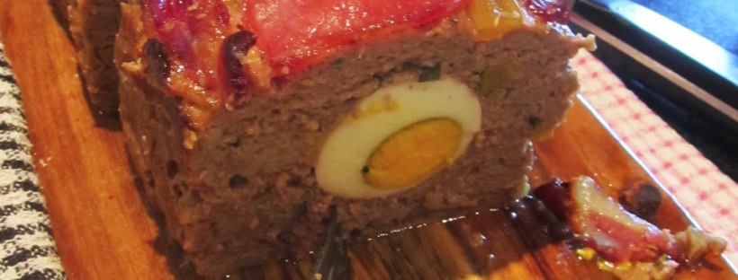 We have an abundance of chook and duck eggs here at the moment, so I hard-boiled half a dozen, shelled them, then placed them in the middle of the loaf before baking.