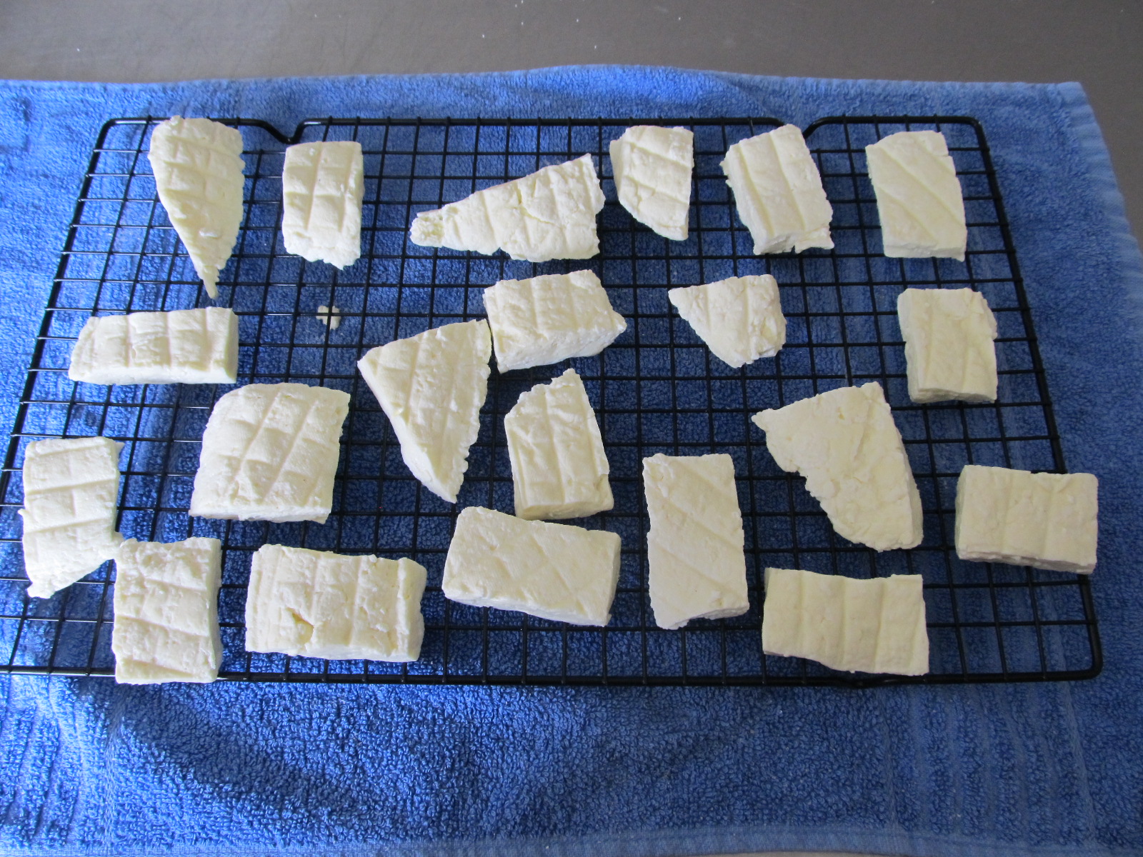 A double batch of feta is now draining in its moulds lined with muslin, and there’s a fresh batch of Halloumi, made with grandson Jacob in mind. He just loves it.