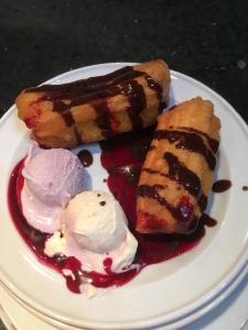 Dessert – lovely fat and light churros, this time with blood orange and blueberry ice creams, blueberry syrup and chocolate ganache.