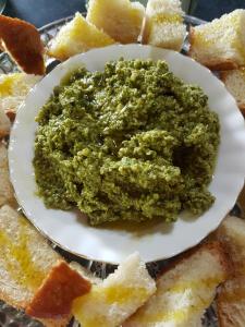 I was able to make a large batch of pesto this morning. Straight from garden to table – served with some homemade bread drizzled with olive oil. The remainder is now frozen in small containers, so convenient to pull out anytime for a quick snack.