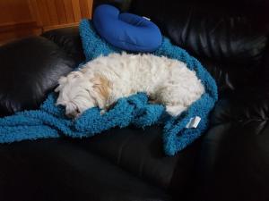 Poor Puppy Poppy sulked in her blanket on the armchair while she waited her turn.