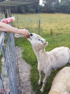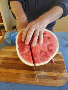 A few little pieces of the melon were kept aside for dear old Ramekin the ram. He is toothless now and on such a hot day, he really appreciated a few pieces of juicy watermelon to suck.