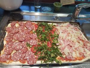 I think Americans refer to tray bakes so I adopted this principle. Grandchildren Charly and Jacob like different flavours, so the pizzas were prepared in strips – from Hawaiian to Pumpkin and feta, Margherita and all sorts of meaty mixtures – pepperoni, pepper and olives, classic meat eaters and so on.
