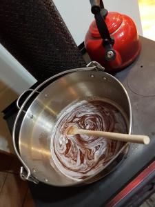 This evening Hester is still at work. After simmering quinces on and off for two days, the final stage of quince jelly is in progress and is on course for being bottled off before bedtime.
