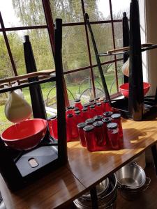 Here are the jars and bottles now, sitting pretty amongst the two batches of yoghurt cheese, hanging in readiness for the cheese making class here tomorrow.