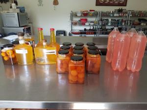 The colour and flavour, the very essence of the cumquats are now captured in bottles. There’s the cordial syrup (in recycled spirit bottles) and lovely orange confit cumquats in jars, cumquat brandy in the making alongside them.