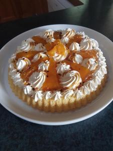 The lemon sponge flan base was brushed with peach jam, then topped with whipped cream, shards of peach jelly and a little passionfruit pulp for extra acidity. I am no decorator to be sure, but thanks to those peaches the flavour was pretty fine.
