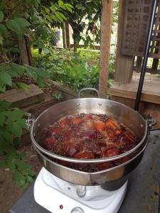 I mixed the ingredients together the night before and left them to sit on the bench to await cooking the next day. Even then the aroma in the cooking school space next morning was overpowering, so outside for its hours of cooking it had to go.