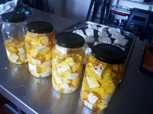 Fun today in the kitchen bringing it all together – jars of herbed feta of each kind in olive oil, as well as a batch of halloumi.