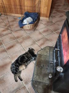 She needs to be in this caged area temporarily to restrict movement, but Rosie is happy again with her buddy at least in sight, and the bonus of a roaring wood heater close by to warm them both.