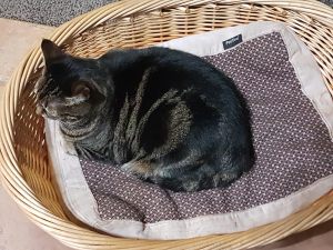 Rose refused to sit on Robert’s knee alone, and retreated to Poppy’s basket, even though it was devoid of the woolly blanket (which was in the wash).