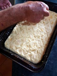 Press mixture evenly into the prepared tin. Using a sharp knife, cut into a diamond pattern and top with the almonds (in centre of each diamond).