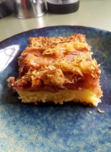 Rhubarb batons were duly oven roasted and placed on top of a lime infused butter sponge. When almost finished cooking, a coconut caramel mixture was poured over and baked to a glaze.