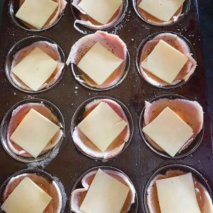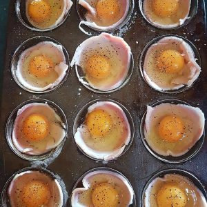 I simply lined muffin tins with bacon, cracked in an egg, left whole, sprinkled with black pepper and topped with a quarter slice of vintage cheddar and baked for about 12 minutes.