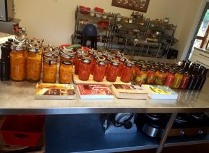 There’s several jars more of apricot halves for instance (can’t have too many of those), preserved tomato segments, pickled zucchini slices (with red capsicum), pickled green tomatoes, semi-dried tomatoes in olive oil and a plum/apricot Worcestershire sauce.