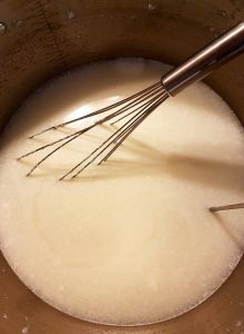High time I used it so now it’s thawed I’m making goat feta. At least I think I am. The mixture looks a bit gloopy in the pan, already kind of curdly.
