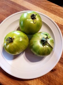 The tomatoes I used were green but not in the sense of under ripe. These were a gift from a neighbour – classified as a zebra breed, due to their stripes) and beautifully sweet and tender.