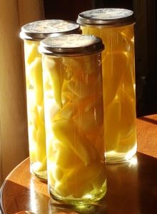 Incidentally, the pears for the cake were some we preserved a few weeks ago. At that time sugar was very hard to come by, and so there’s none at all in their surrounding preserving liquid.