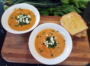Once combined, the end result soup (with chicken stock and milk added) was pureed and topped with spring onion and celery leaves from the garden, along with a little crumbling of feta.