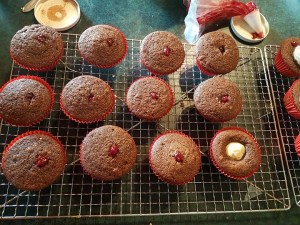 A little raspberry jam, the last in a jar in the fridge, was piped in after baking for extra flavour.