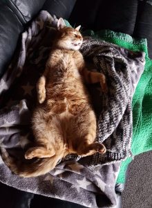 Old Tom seems happy about it all, asleep and smiling on his bed of blankets on the couch.