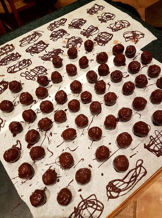 A piece of pumpkin fruit cake was crumbled, then mixed with coconut rum and melted chocolate to make a kind of truffle, then dipped in more melted chocolate.I could never be accused of being neat of course, but the chocolate coated those truffles like a dream.