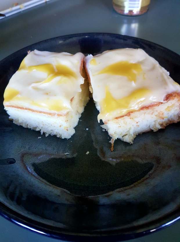 A hastily made cream cheese icing was spread on the cooled cake, then little dollops of the lemon curd were swirled over.