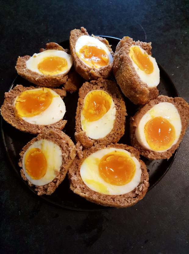 (Note the colour of the eggs, courtesy of our pampered chooks).