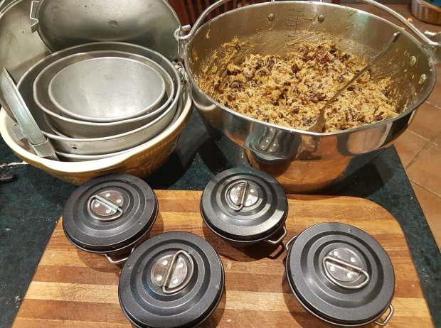 I’d also bought various pudding basins at ops shops over the years, with what I thought were matching lids – not quite so, but that’s ok, a covering of 2 layers of foil and tied around the rim served the purpose.