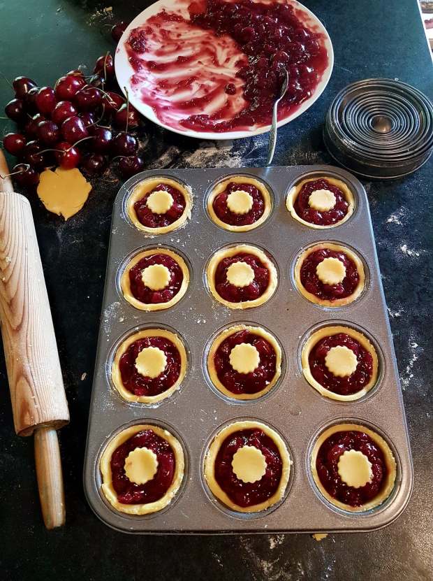 Act 2 – cherry shortcake tartlets, here shown waiting their turn in the oven while the apricot tarts were baking.