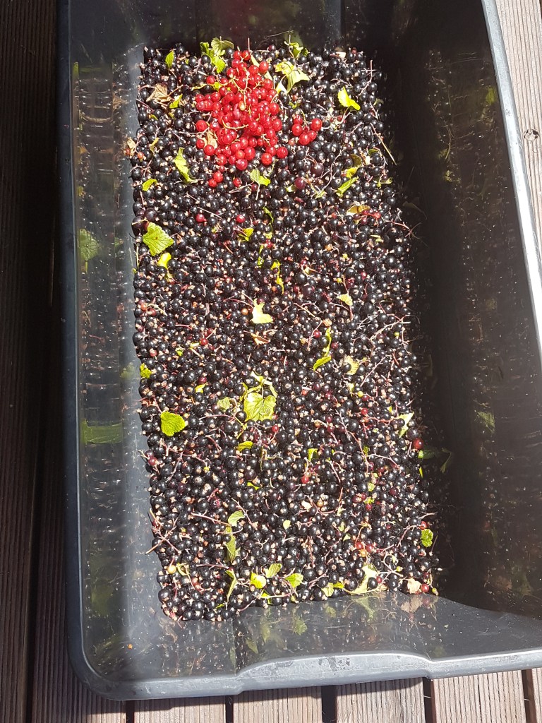 Meanwhile fresh picked from the garden here this afternoon, 14 kilos of blackcurrants and jostaberries. Only a very few redcurrants amongst them. Think the chooks had been feasting on those.