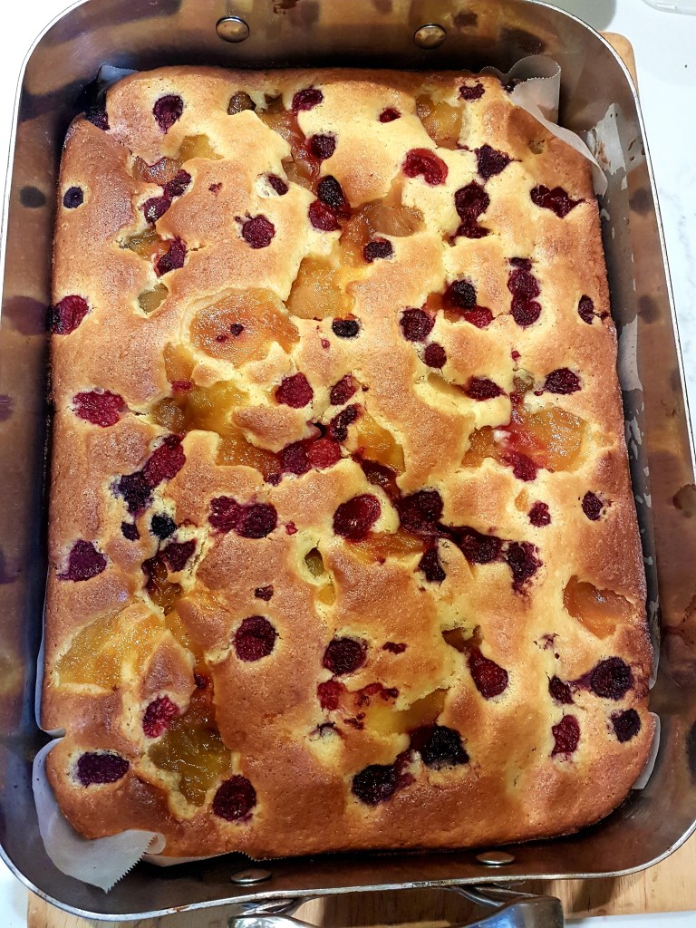 The apricots were preserved halves, though of course you could use fresh or tinned, and the raspberries from our garden, just starting to ripen (finally!!)