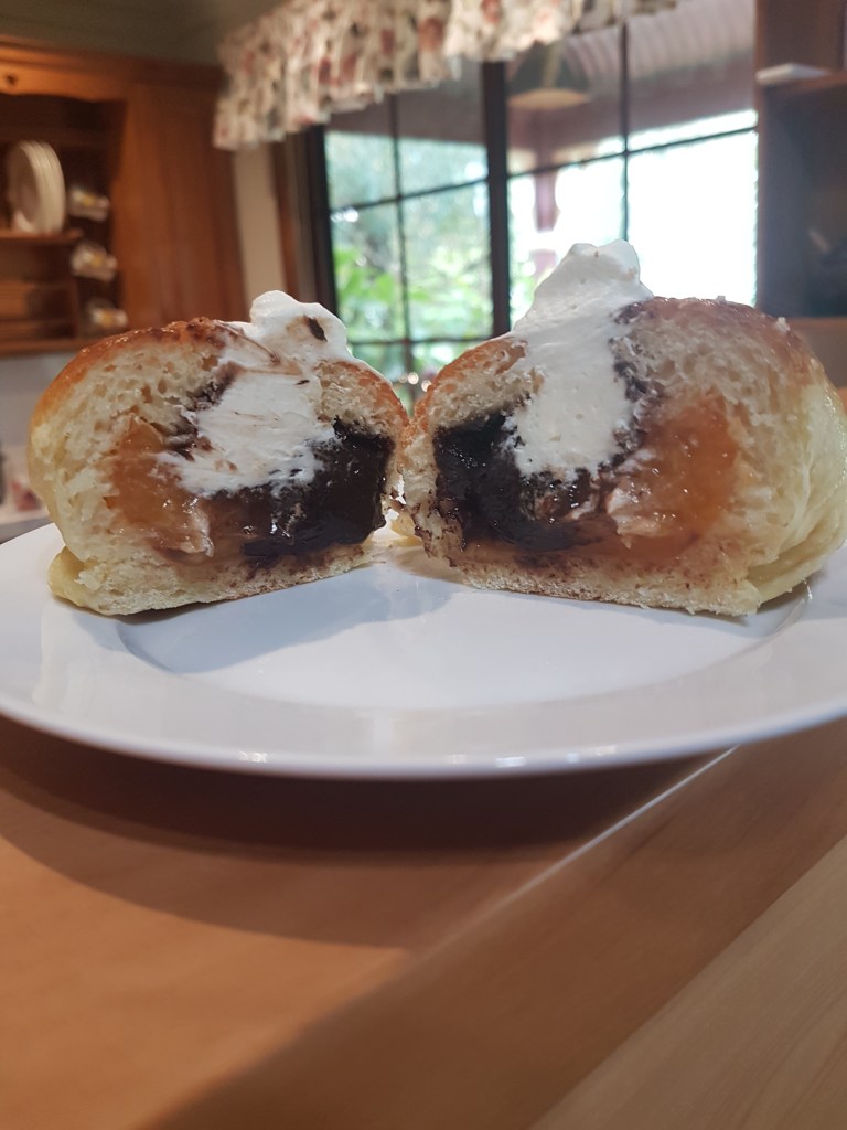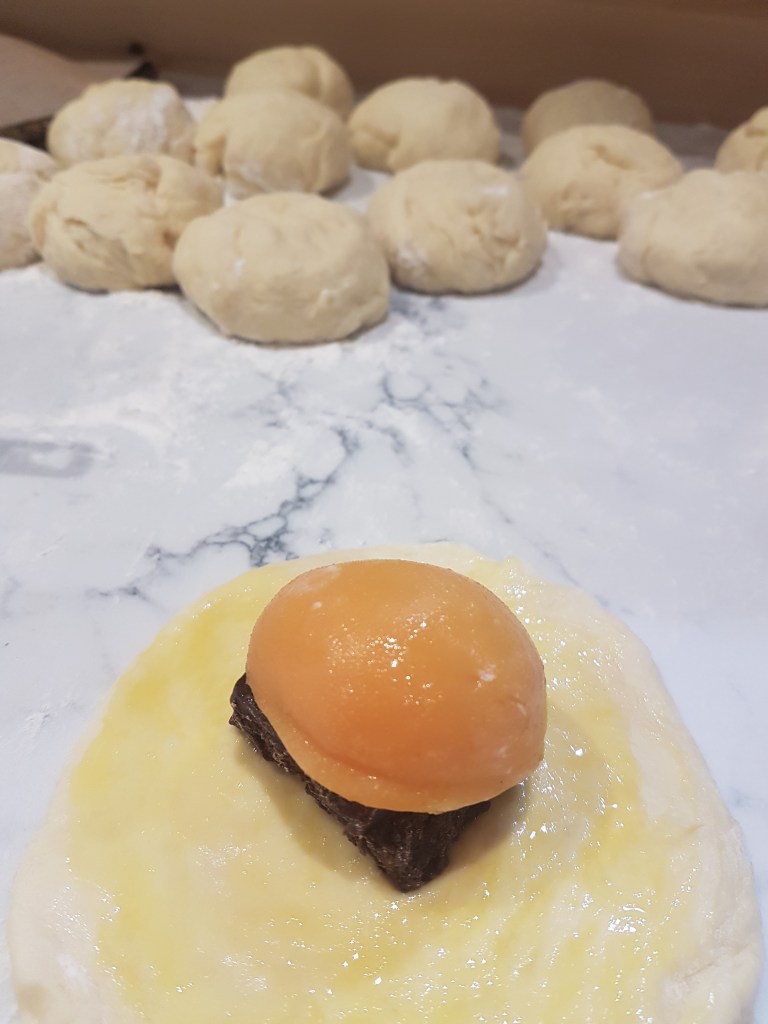 I thought it needed a little acidity, so topped with preserved apricot halves, then enclosed in 12cm diameter circles of the dough, let them rise and then baked them.