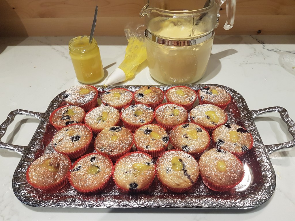(The story of the Custard Club can be found in “The Comfort Bake”, as can the recipe for the muffins and also the lemon curd, this last a part of the recipe on page 96).