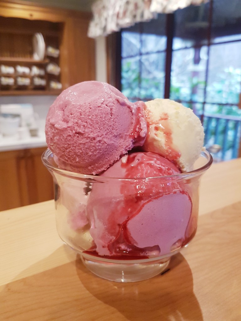 In the glass dish pictured are three types of ice cream – mulberry (flavoured with mulberry syrup), lemon curd based and thirdly, blackcurrant coconut (vegan).