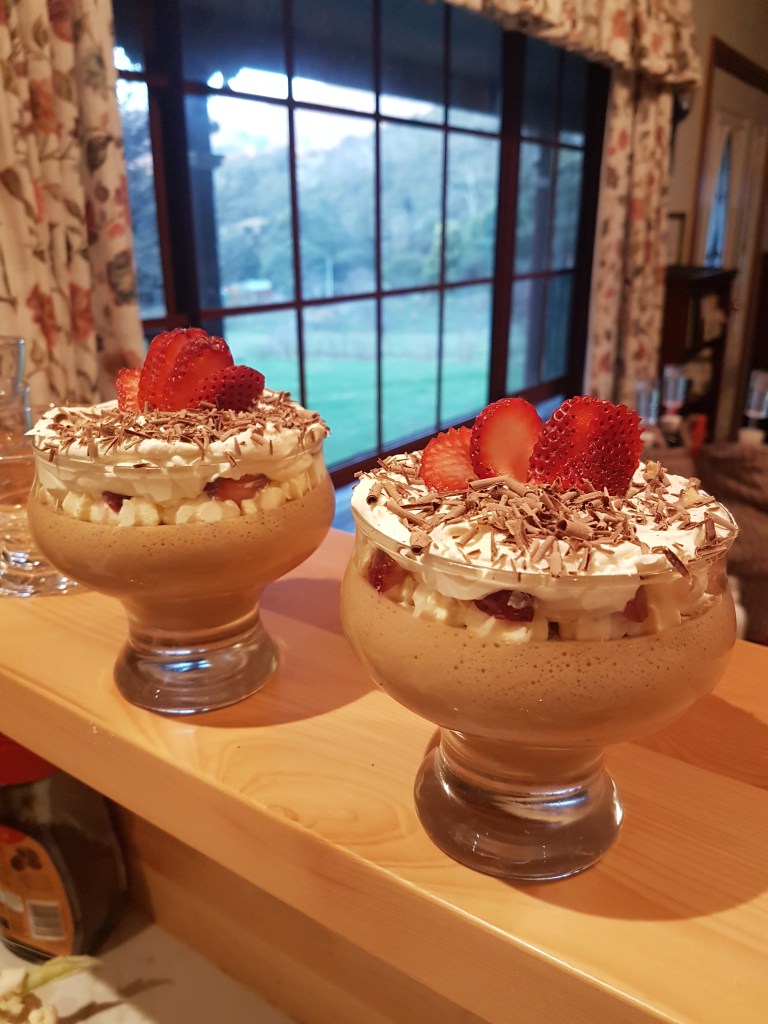 Decorate with whipped cream and berries + shards of chocolate if liked.